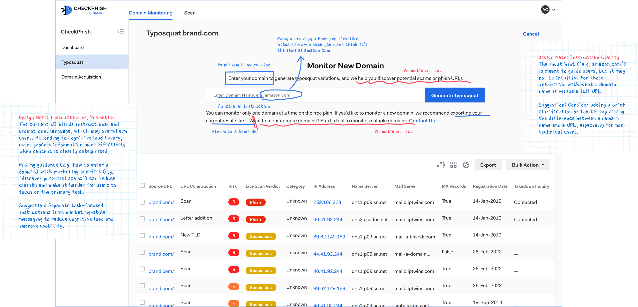 Cybersecurity tools often face a fundamental challenge: translating highly technical functionality into something intuitive for everyday users. Working on a product like CheckPhish, a tool that leverages AI to identify phishing threats and suspicious domains, I encountered a particularly knotty design problem.