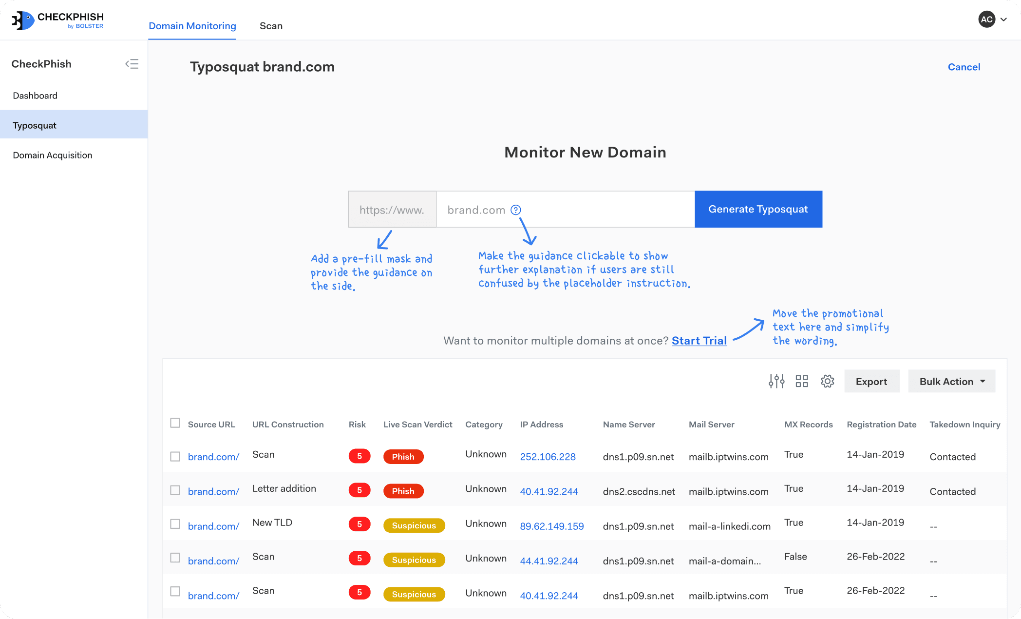Domain Monitoring – Enter a domain to generate look-alike domains and detect possible impersonations.