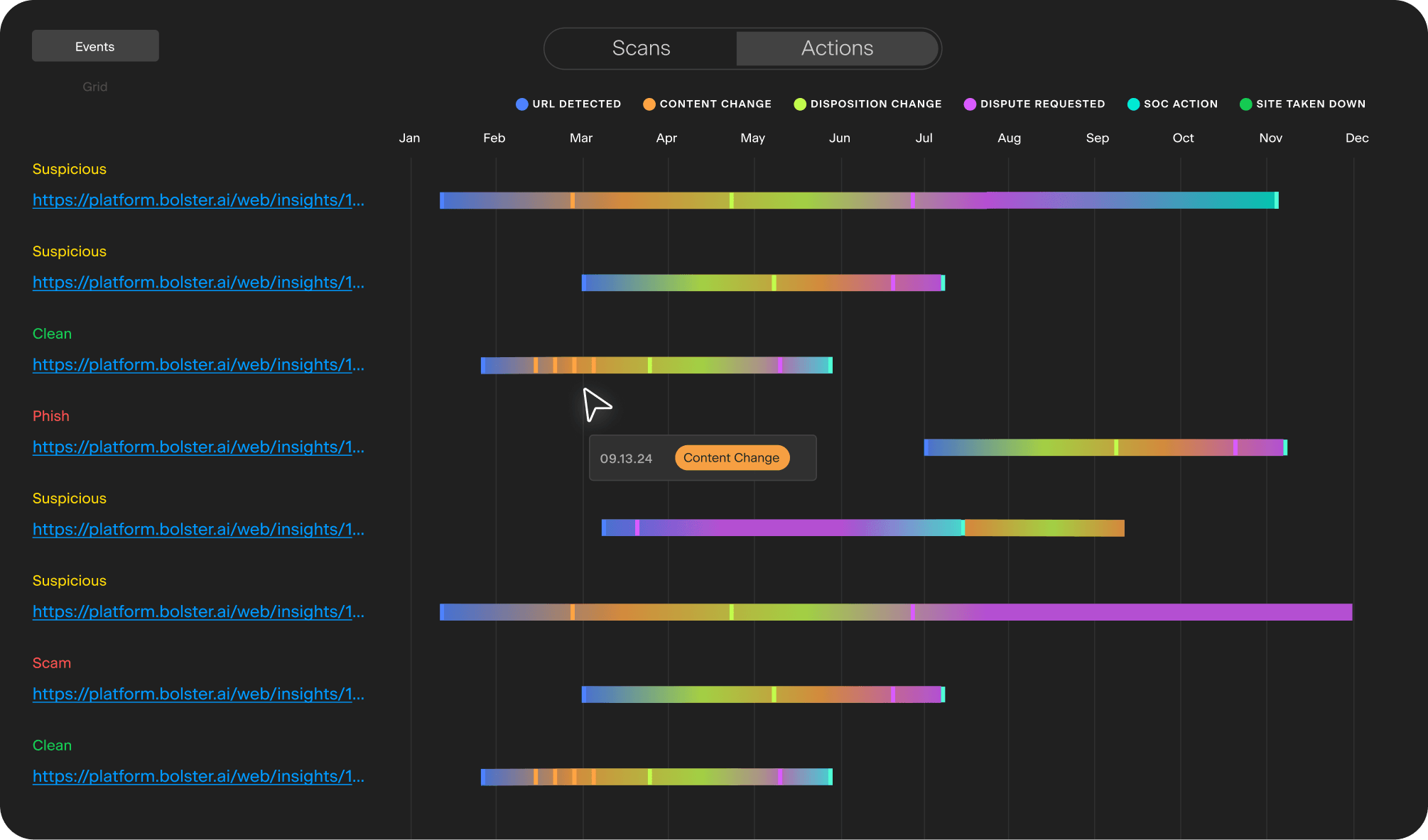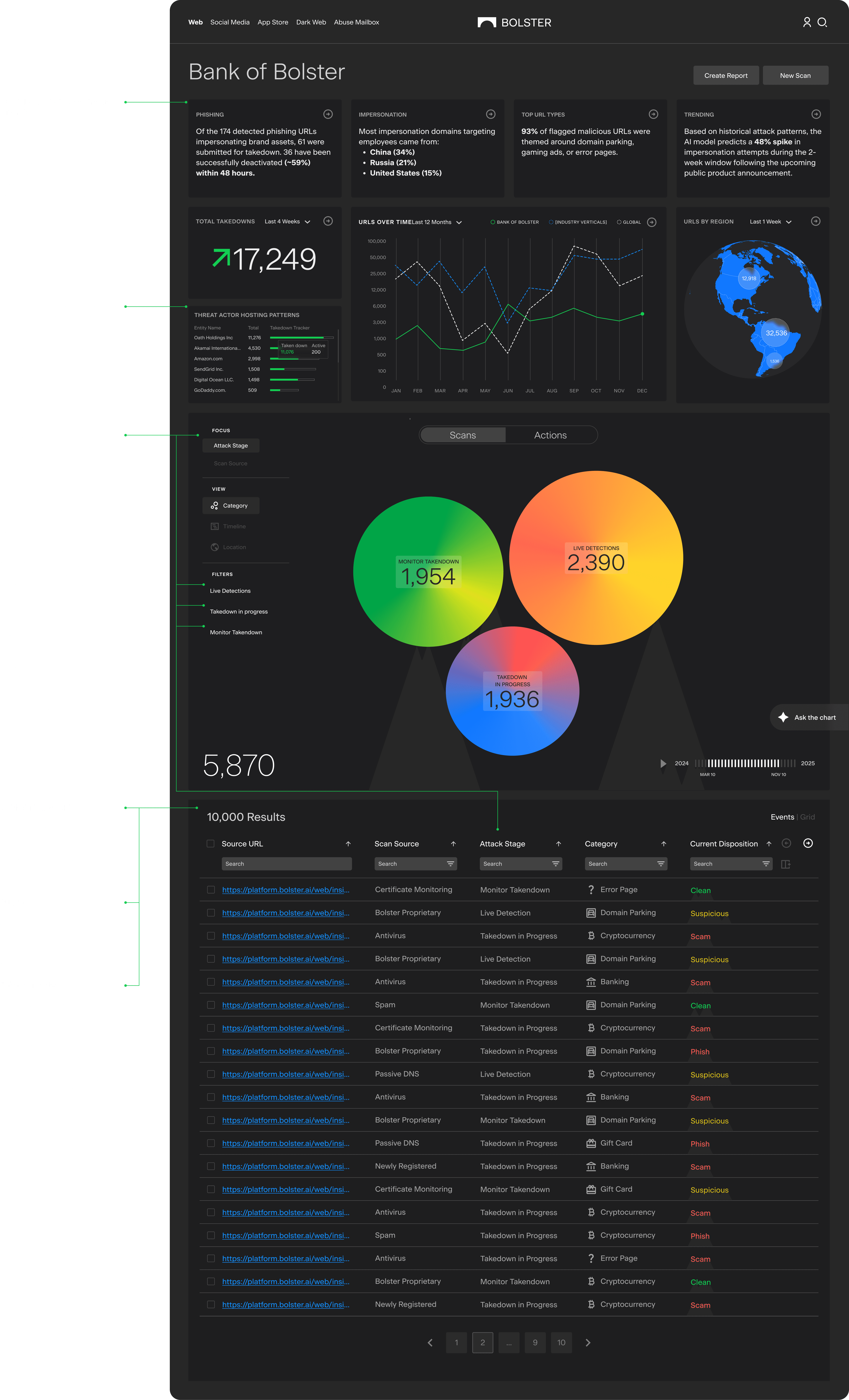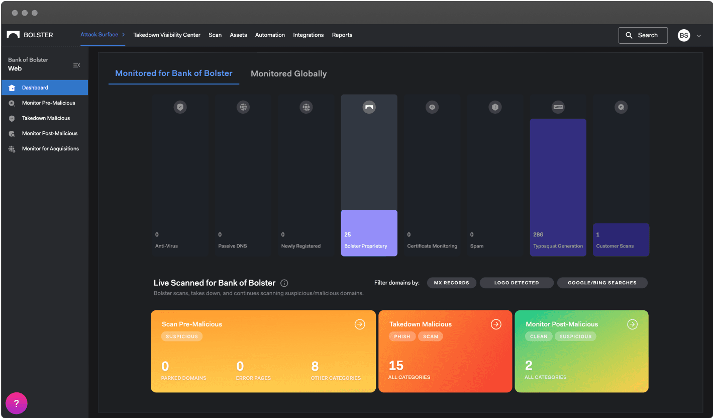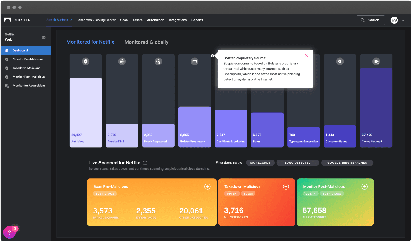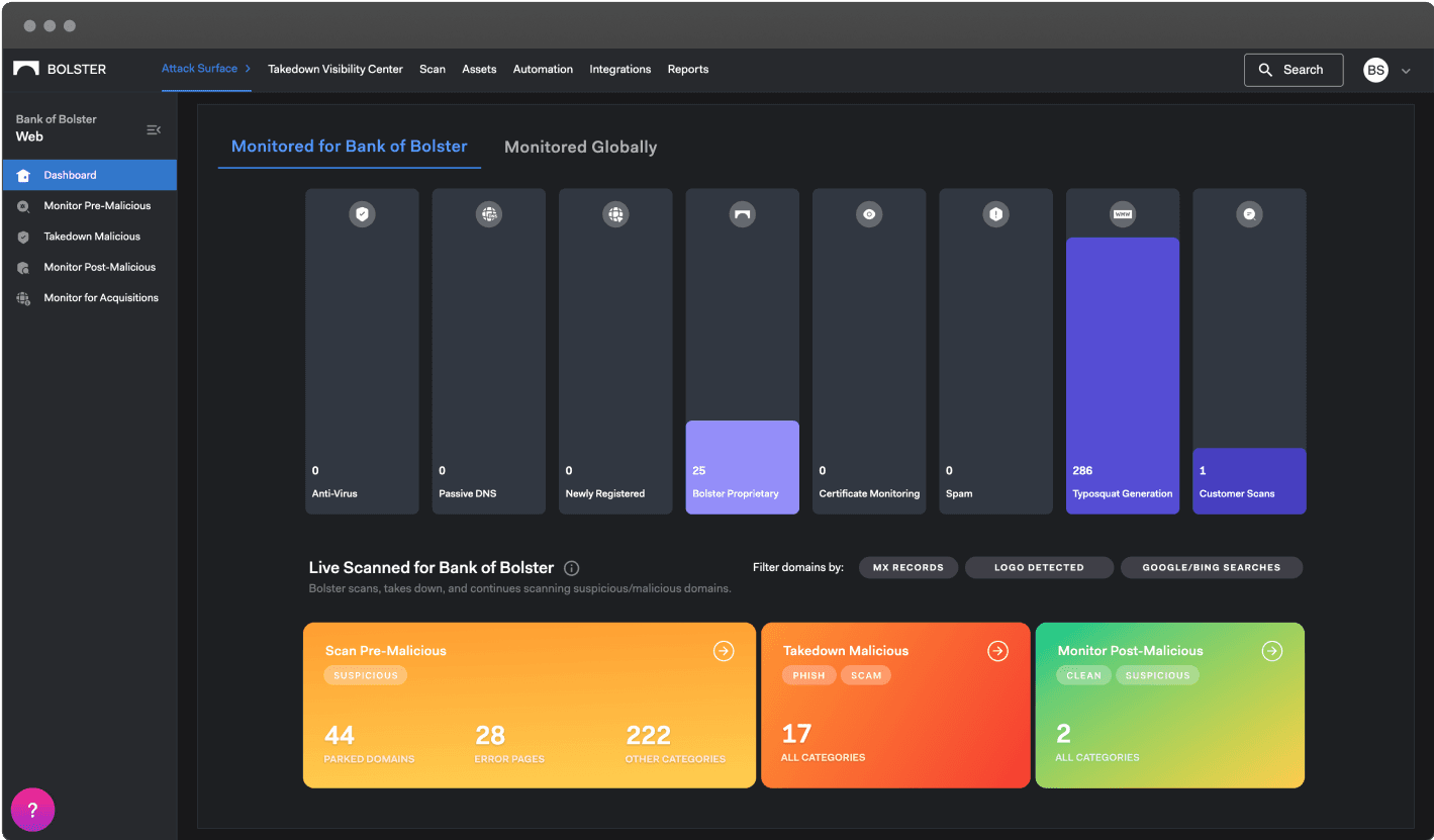 The left menu labels (Pre-Malicious, Post-Malicious, Takedown Malicious) may confuse users—consider using clearer terms like Live Detections, Takedowns in Progress, and Taken Down instead.